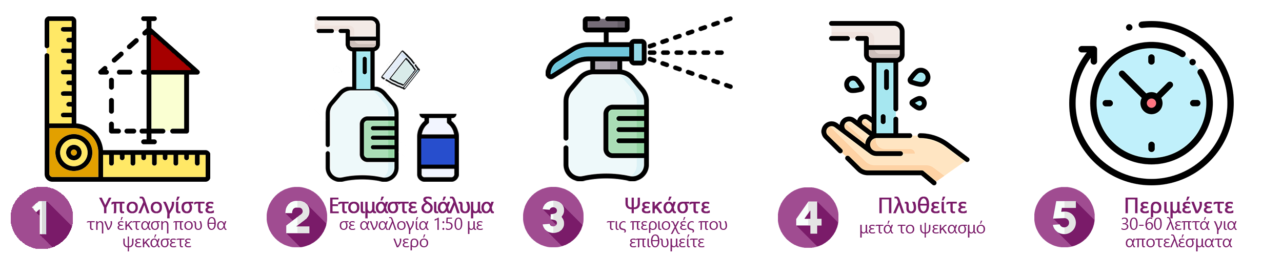 Μετρήστε τον κατάλληλο όγκο του προϊόντος χρησιμοποιώντας τη συσκευή δοσομέτρησης που παρέχεται στο πακέτο προϊόντων. Η εφαρμογή γίνεται με τη χρήση οποιουδήποτε συμβατικού χειροκίνητου ψεκαστήρα ή ψεκαστήρα με σκανδάλη.